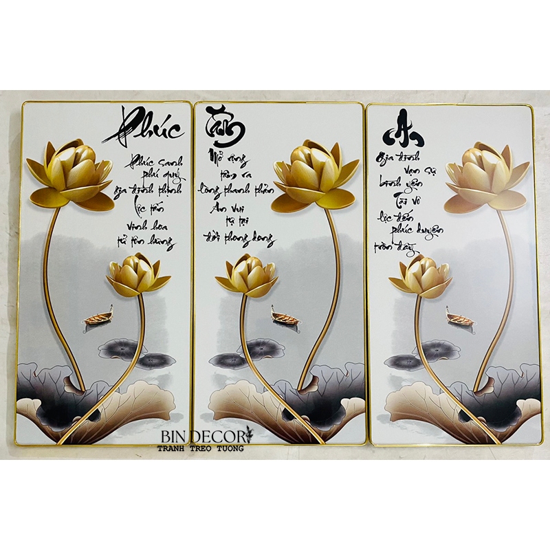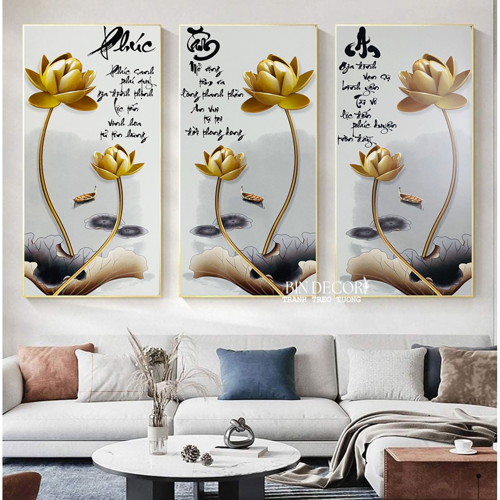 (ẢNH THẬT) Tranh treo tường 3 tấm phúc tâm an tranh phòng khách kèm đinh treo