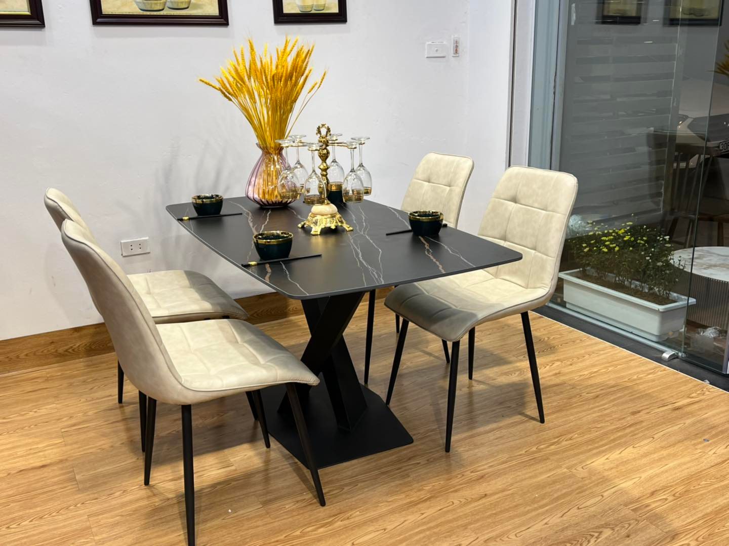 Bàn ăn mặt đá phiến chân chéo, chân sắt sơn đen tĩnh điện