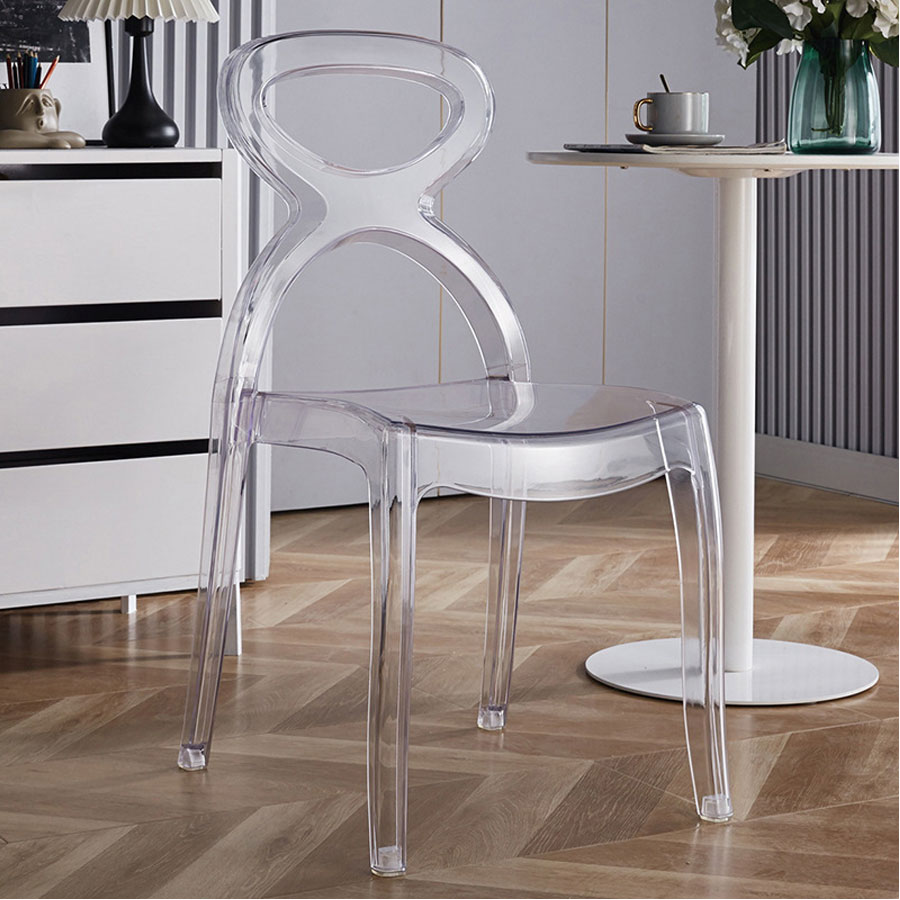 Ghế nhựa trong suốt có thiết kế không tay gọn nhẹ dễ dàng di chuyển. Lưng ghế cách điệu đẹp mắt, nệm ghế có độ cong nhẹ giúp người dùng thoải mái khi ngồi.
