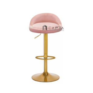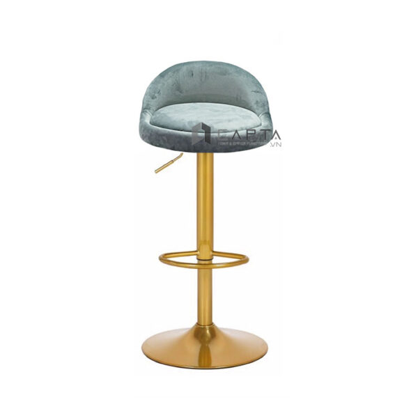 Ghế bar lưng thấp nệm vải nhung nhiều màu sắc. Thiết kế nhỏ gọn, kiểu dáng hiện đại. Chân mâm dạng một trụ, pen tăng giảm chiều cao tiện lợi, được mạ màu vàng sang trọng.