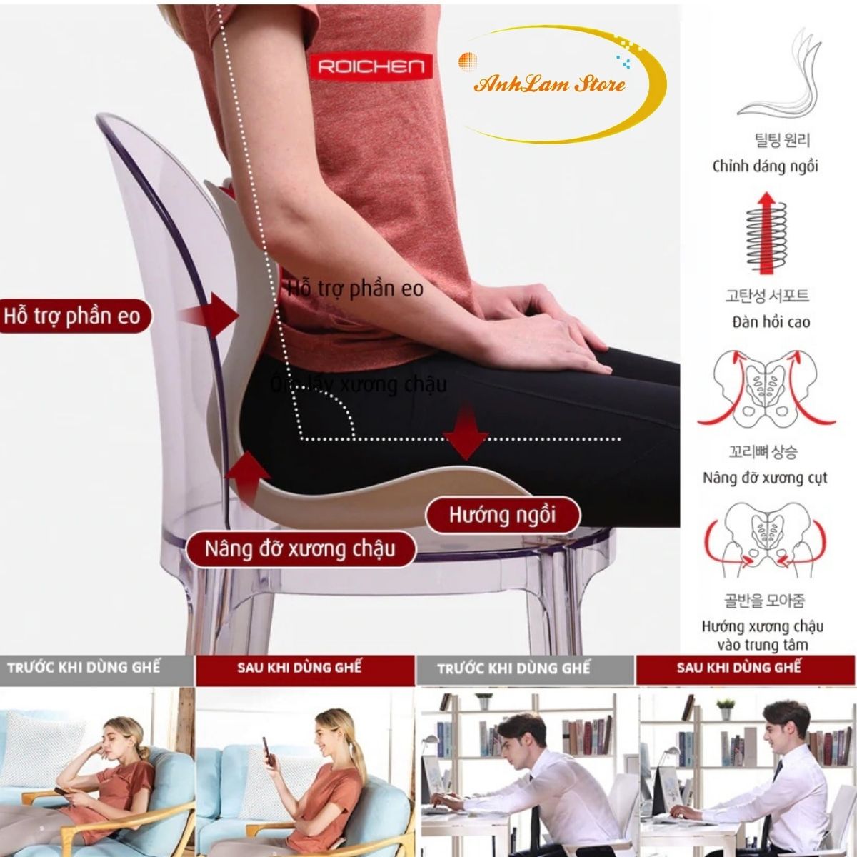Hướng dẫn sử dụng: Đặt ghế chỉnh dáng ngồi đúng cách lưng ghế ngồi từ 10-15cm. Giữ ghế bằng cả 2 tay khi ngồi và đặt hông sâu trong ghế. Trọng lượng cơ thể sẽ tự đẩy hông ra sau tạo tư thế ngồi đúng.
