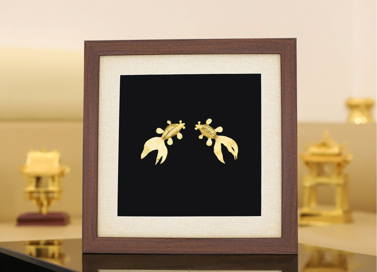Với phương Đông, Cá vàng (hay “kim ngư”) còn có nghĩa là vàng bạc dồi dào. Hình ảnh hai chú cá vàng thanh thản bơi trên làn nước trong tạo sự thư thái, ung dung tự tại. Đôi cá được mạ vàng và gắn trên nền với hoa văn nước và lá đóng trong khung tranh được thiết kế đặc biệt. Dáng mềm mại của cặp cá vàng hiện thân cho sự nhàn tản, phú quý, hướng thượng và thủy chung. Ngoài ra, cặp đôi cá vàng còn biểu trưng cho sự thành đạt về danh vọng và tài lộc.