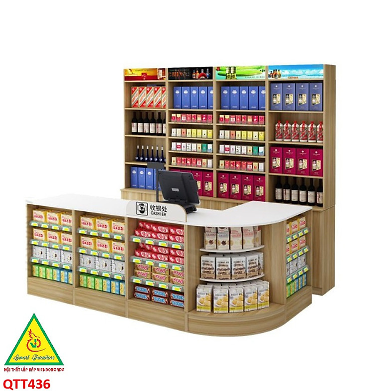 Phần tủ trưng bày sản phẩm phía trên với các đợt kệ,bên dưới là các cánh tủ dung bản lề thủy lực mang đến sự tiện lợi khi sử dụng lưu trữ sản phẩm. Tay nắm thiết kế tối giản, hiện đại mang đến sự tính tế cho thiết kế trưng bày sản phẩm.